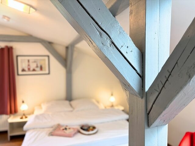 Die Kleene Helene ist unser kleines Kuschelapartment. Die charmante 1-Raumwohnung befindet sich im Obergeschoss des alten Bauernhauses. Sie ist wohl die gemütlichste unserer Ferienwohnungen. Klein aber fein. Perfekt für eine Auszeit zu zweit. Obergeschoss, 2 Pers., 1 Doppelbett, Dusche